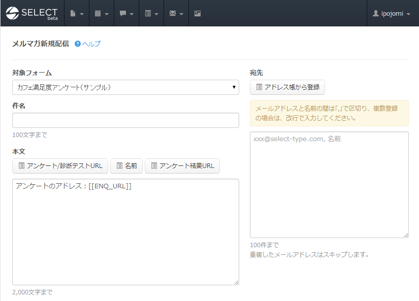 アンケートフォームをワンタッチでメルマガ配信して、多くの回答者からサンプルを収集しましょう。SelectTypeならメルマガの告知だって簡単にできます。