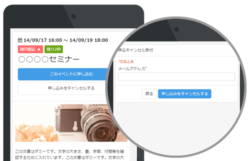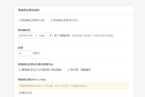 受付方法は、承認制の受付と自動受付のどちらか選べたり、キャンセル待ちの受付ができたり開催されるイベントに合わせた柔軟な設定が可能です。