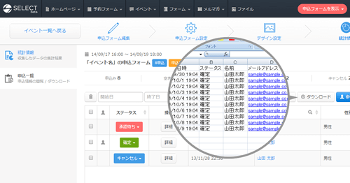 参加者リストはSelectTypeのデータベースに履歴として保持されます。参加者リストはCSVでダウンロード可能です。当日の出欠管理に利用できます。