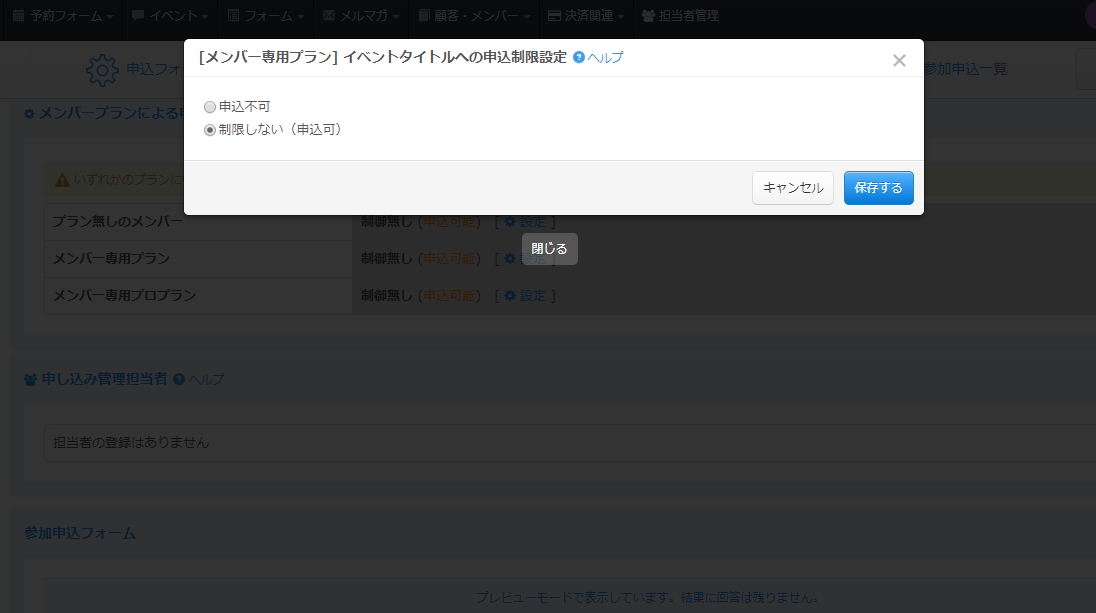 メンバープラン機能を使用すると、プランによってイベントへの参加申込の可否を設定することが可能です。