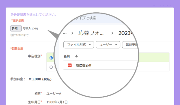 身分証提示など参加申込者様に資料提示を求めたい場合には、参加受付と同時にファイルの提出を受付けることが可能です。提出いただいたファイルは連携したGoogleドライブに自動アップロードされ、SelectTypeの管理画面からもGoogleドライブに直接アクセスしてでも参照が可能になります。