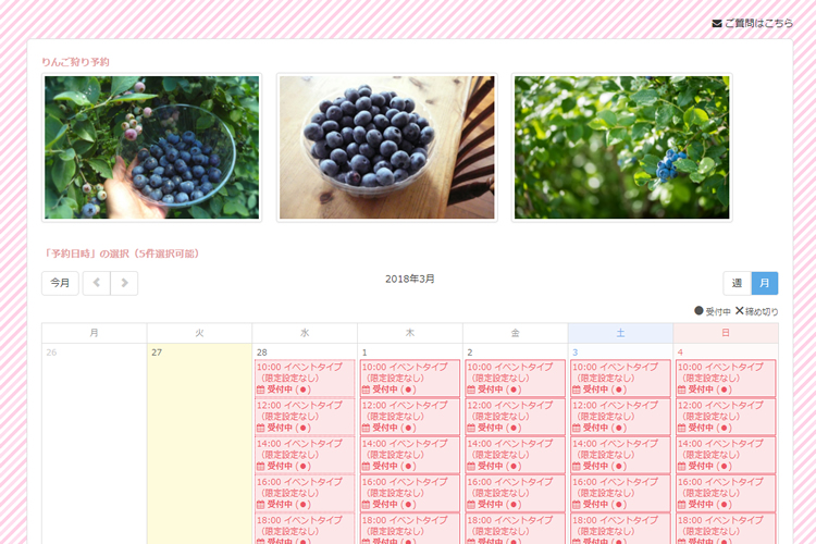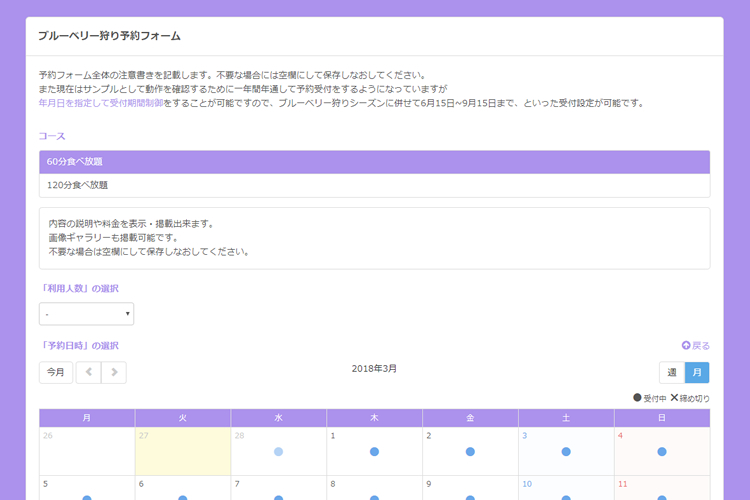 SelectTypeの予約システムでは、完全にオリジナルでコース受付を再現出来ますのでブルーペリー農園でご用意しているコースに応じて最適なセッティングを行うことが可能です。