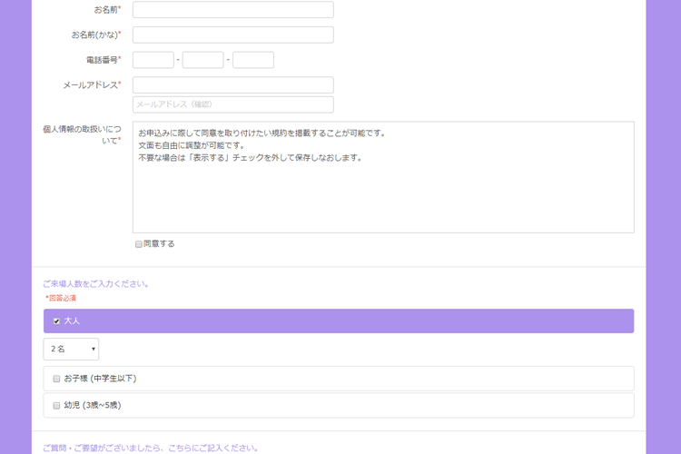ご予約受付の際には「ご来場人数」「ご来場者の構成(お子様の人数は?)」「代表者様のお名前とご連絡先」など必ずヒアリングしておきたい項目があることでしょう。SelectTypeの予約システムではもちろんこられ重要情報のヒアリングは完璧です。併せて“質問機能”によって選択質問やフリー記述式の質問を用意出来ますので、当日のご希望・ご要望やかんたんな事前アンケートも実施出来るんです!