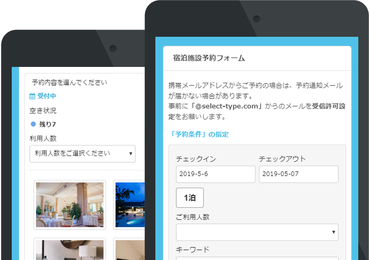 SelectTypeの予約フォームは、一度セットアップすれば「スマホ・タブレット・パソコン」いずれの端末にも対応してネット予約受付が可能になります。