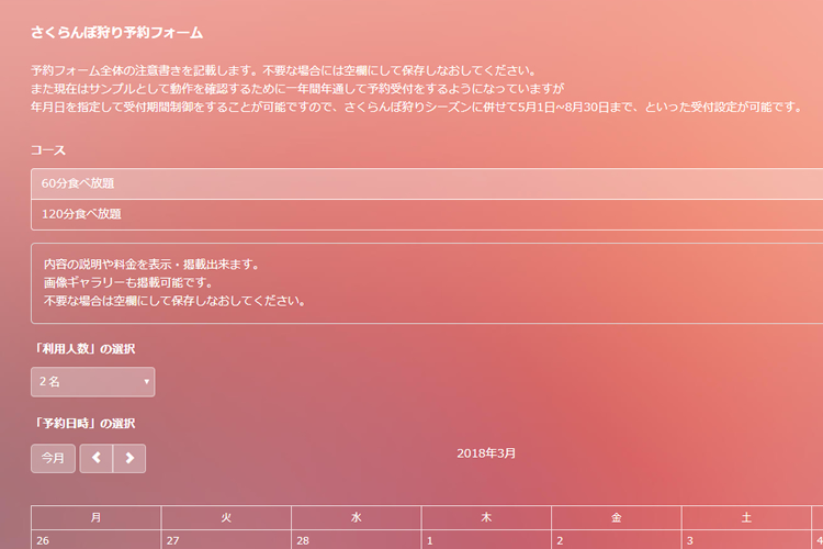SelectTypeの予約システムではコース選択メニューを予約フォームに用意して、お客様にお選びいただくことが可能です。例えばさくらんぼ狩りツアーでも時間制限であったり、あるいは桃やプラムなど農園の他のフルーツ狩りと組み合わせたコースをご用意されているケースもあるでしょう。