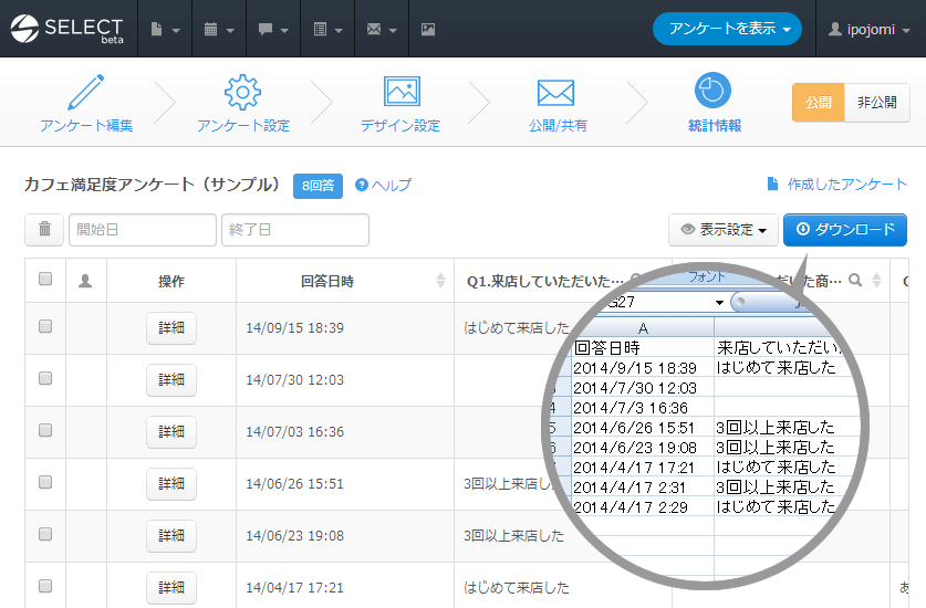 Web上でグラフによりリアルタイムの統計閲覧が可能ですし、CSVファイルとして回答リストをワンタッチ出力することも可能です。