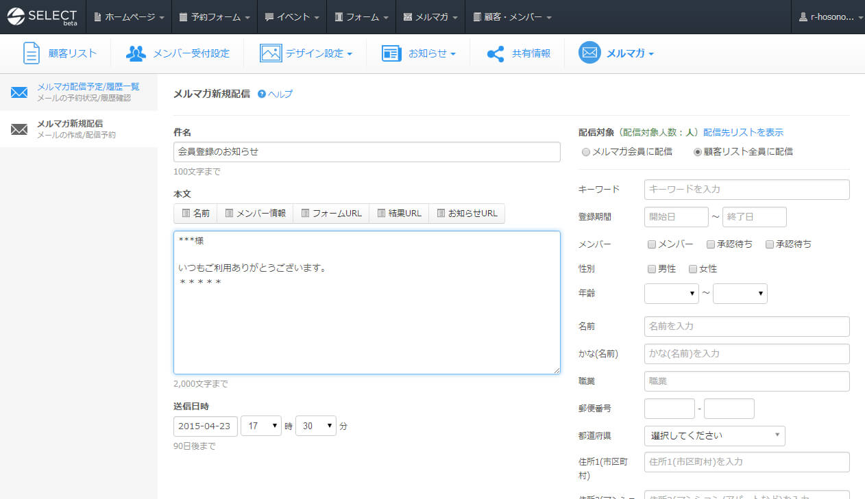 SelectTypeはメルマガ配信機能も提供していますので、セミナー・説明会の参加者にかんたんにメルマガ配信することも可能です。