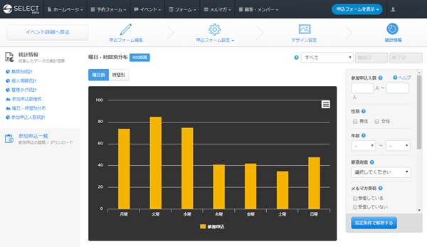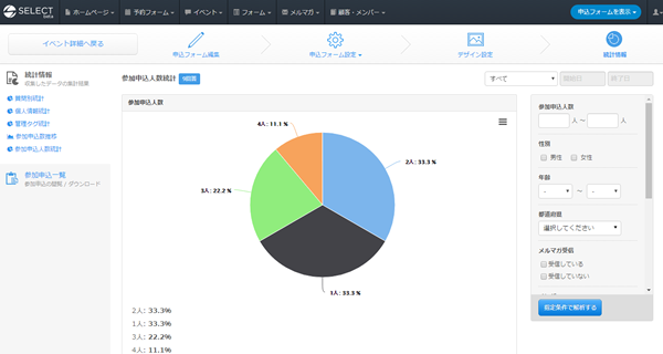 申込情報をもとに集計された統計情報が閲覧可能です。