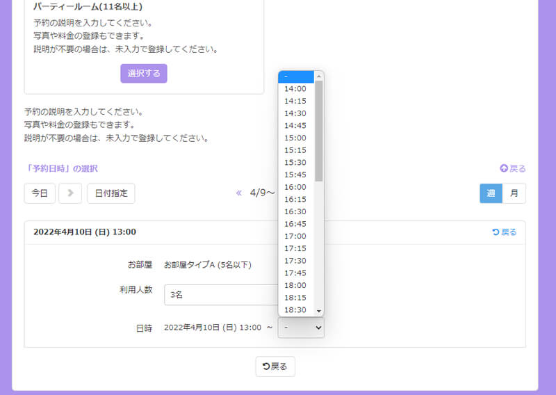 SelectTypeの予約システムでは分単位で細かくお客様の希望ご予約時間のヒアリングが可能です。10分、15分単位でのご利用時間を提供することの多いカラオケ設備提供サービスのニーズをカバーした予約システムとなっています。もちろん空き時間情報も10分、15分単位で表示されますので(調整可能)、効率的にお客様を受け入れることが出来ます。
