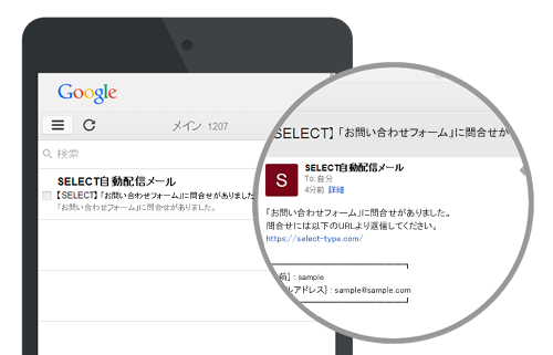 SelectTypeのメールフォームなら、フォームに応募があったらあなたにリマインドメールでお知らせします。
