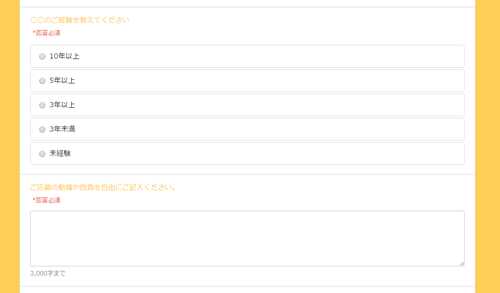 募集する人材に求めるスキルや経験をヒアリングするための質問項目が様々な形式で設置できます。