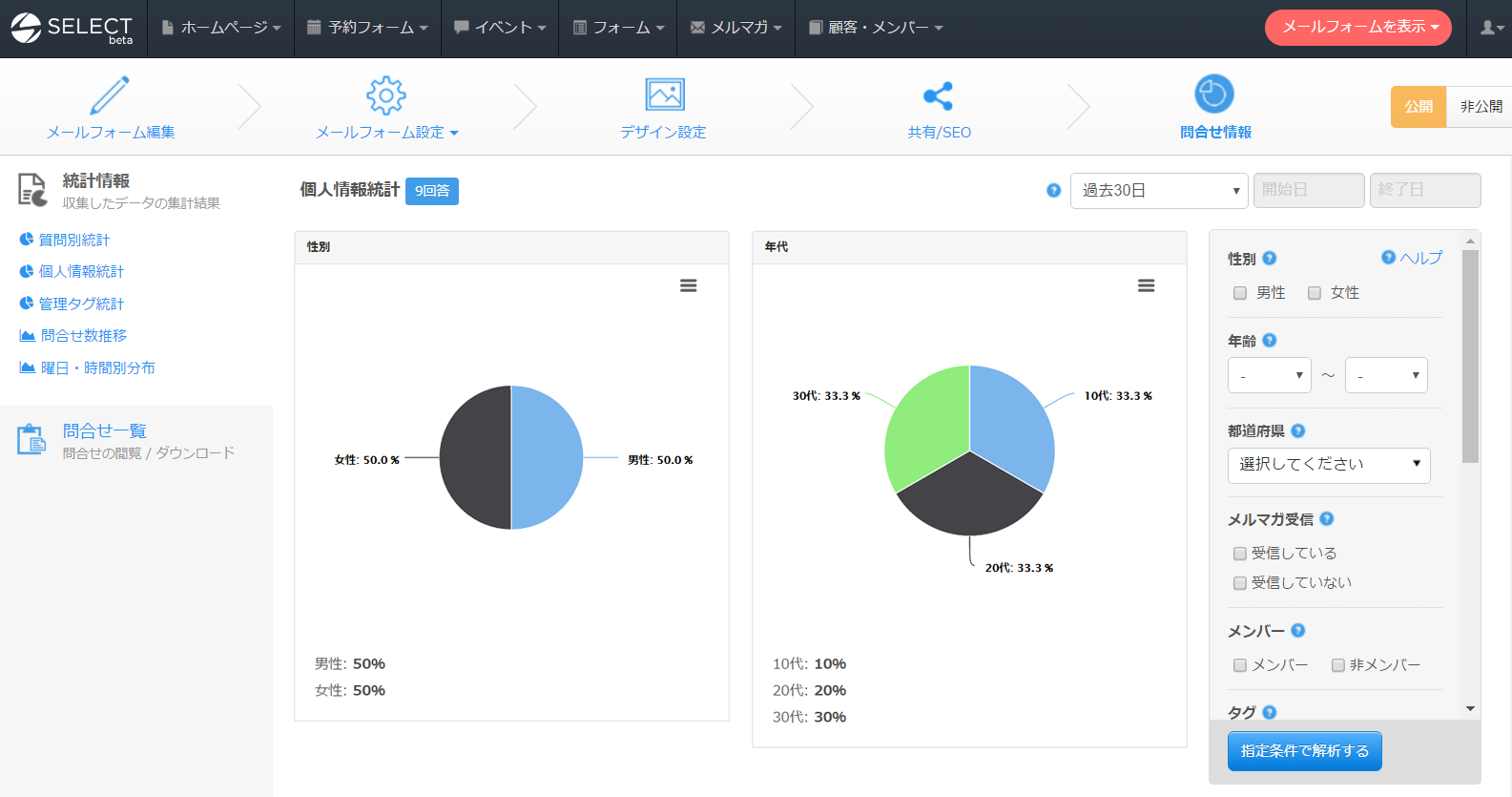 問合せ数推移、曜日・時間別の分布や個人情報統計など