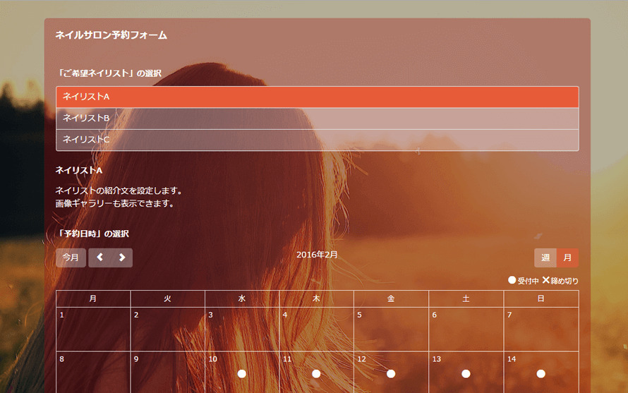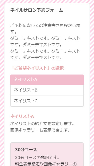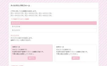 予約フォームごとに紹介文や画像ギャラリーが表示できますから、ネイリストの個性に合わせた予約カレンダーが作れます。つまりネイリスト専用の予約受付ホームページの出来上がりです。