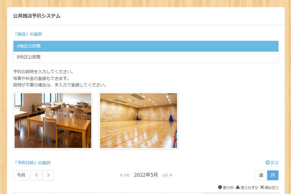 SelectTypeの予約システムは公民館や集会場、運動場・体育館や交流センターなど様々な地域公共施設の予約システムとしてご利用いただいています。画像ギャラリーやリッチテキスト・絵文字も掲載可能ですので、ビジュアルでの施設紹介ページを作成いただけます。