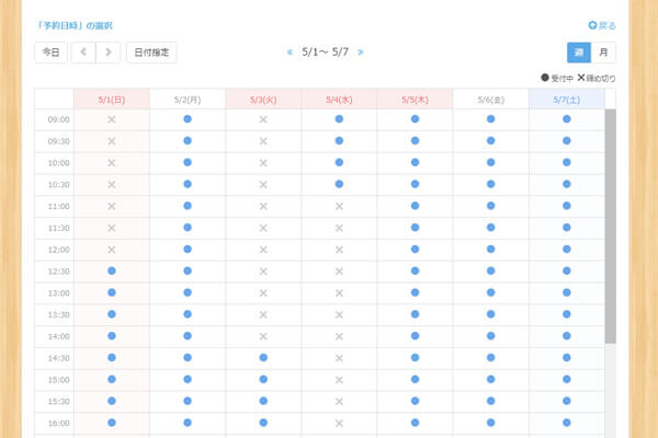 SelectTypeの予約システムは柔軟なスケジュール調整・設定が可能です。基本的な受付時間の設定のみならず、突発的な休館・受付時間の短縮・受付時間の延長など柔軟に設定調整いただけます。イレギュラーなお休みや受付枠の調整も広範囲にカバーします。