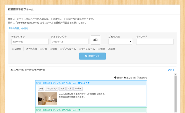 お客様はご希望条件を自由に指定して、予約システムからマッチするお部屋のご提案を確認することが出来ます。