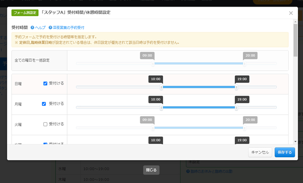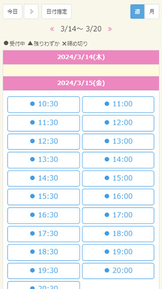 スタッフのシフト、臨時の出勤/お休み、同時に接客できる数を登録すれば、後はシステムが自動的に受付スケジュールを作成して予約受付カレンダーを表示します。