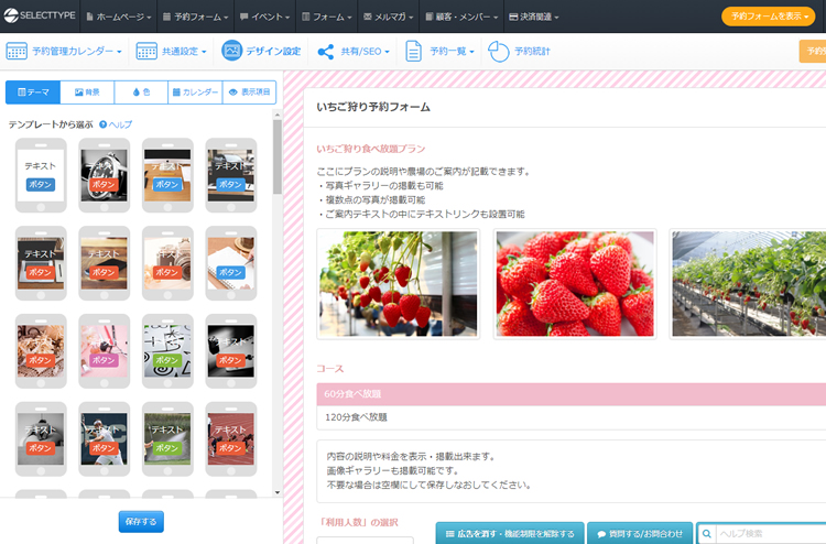 豊富なデザインテンプレートの中からワンタッチでデザイン変更をすることも出来ますし、画面の背景にオリジナルの画像を設定したり、カレンダーやボタンなどの色も細かく調整出来ますので、農園やいちご狩りの雰囲気にあわせたオリジナルの予約フォームが出来てしまいます。