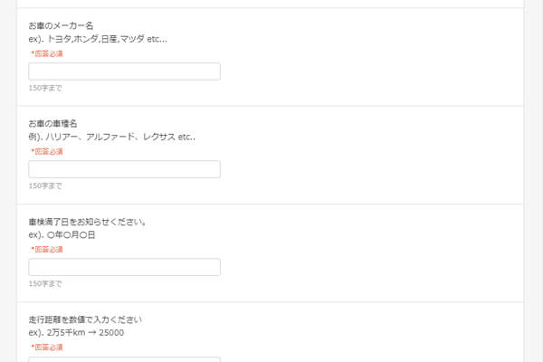 予約日時をヒアリングするだけでなく、細かい質問を設定して十分な事前ヒアリングを実現するのもSelectTypeの特徴です。スムーズな車検受け入れのために、車種・メーカーといった対象車情報をヒアリングしておいたり、あるいは代車のご希望をお伺いするなど高度なカスタマイズが可能です。