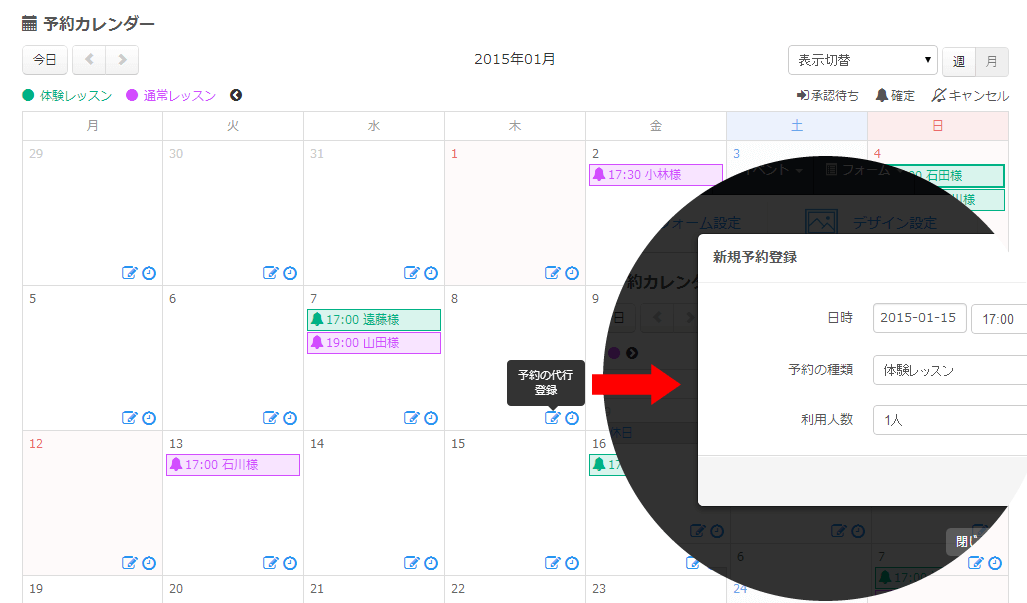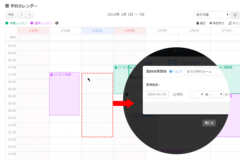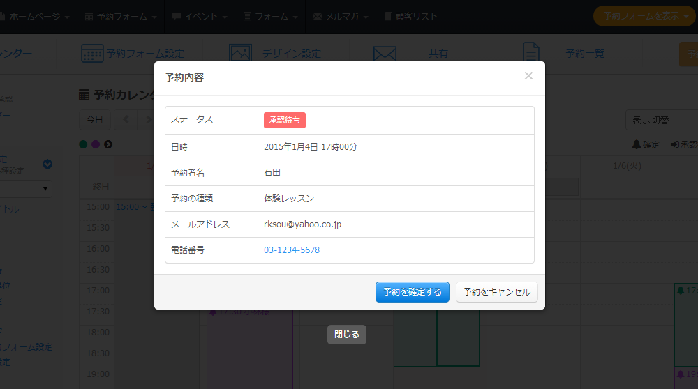 カレンダー上から予約したい時間帯をクリックし、予約された方のお名前やアドレスを記入するだけで登録できます。