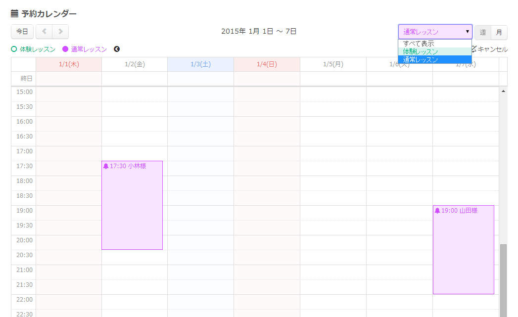 SelectTypeの予約システムでは、カレンダー上に予約された顧客名と予約時間が表示され「いつ予約されているか」が確認できます。また臨時で設定されたお休みの情報や定休日も表示されます。